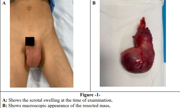 8-year-old boy presented to the clinic with a history of trauma by his brother to genital area. The family noticed left hemiscrotal swelling after the previous trauma. When the patient was presented to the clinic, he had painless swelling in the left scrotal with no overlying skin changes, which was inseparable from the left testicle and non-reducible, extending to the inguinal area (Figure1 A).