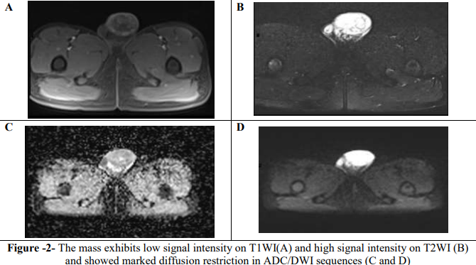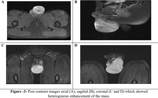 Then, the decision to perform a scrotal MRI and the report showed a large mass seen in the left hemiscrotum extending to upper inguinal canal. There was a clear cleavage line observed from the left testis. It demonstrated low signal intensity on TIWI and high signal intensity on T2WI, showing marked diffusion restriction in ADC/DWI sequences, and heterogenous post-contrast enhancement. The mass causes mass effect and compresses the left testis, which showed normal signal intensity (Figure3 and 4). The MRI findings were suggestive of paratesticular tumor, with embryonal rhabdomyosarcoma being the top consideration in the differential diagnosis.