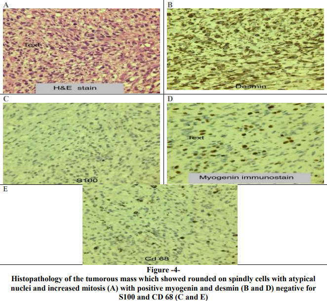The results showed tumorous tissue composed of rounded and spindly cells with atypical nuclei and increased mitosis, these cells were found to be positive for myogenin and desmin (positive), while negative for S100 and CD 68 (Figure 3). The findings were consistent with embryonal rhabdomyosarcoma.