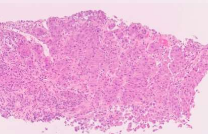 Based on the CT findings, a lung primary was suspected. A lung core tissue biopsy was taken on the 28th of March. It revealed non-small cell lung cancer; most likely a poorly differentiated SQUAMOUS cell carcinoma (SCC). The background stroma was desmoplastic with a near absence of associated chronic inflammation, there was no tumour infiltrating lymphocytes (TILs).
