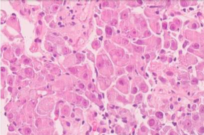 The biopsy from the left perinephric lesion revealed deposits of an adenocarcinoma with remarkably similar morphology (nested and sheet-like pattern) (pink) and immunophenotypical characteristics to the prior bone biopsy viz. it too expressed epithelial markers (CK7, CK19)and HepPar1 (while still being negative for Glypican 3, TTF1, Napsin A, p63, p40, RCC, CD10, PSA, Calretinin, Melan A, Synaptophysin, chromogranin and CK20).