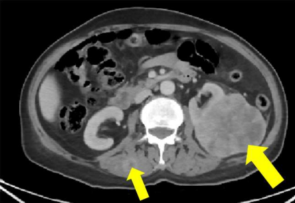 Fig: Pan-CK highlighting the tumor cells in the left perinephric fat lesion.