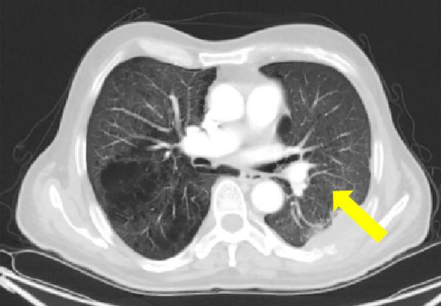 On July 17,2023, a re-evaluation CT scan after 6 cycles of chemotherapy-immunotherapy showed stable lung mass (4.3x2.9x5.3 cm compared to 4.9x3.2x5.4 cm). There were no other suspicious metastatic pulmonary nodules.