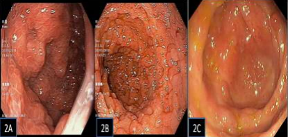 Figure 2: Endoscopic images: Gastric body numerous polyps (2A), Duodenal / D2 polyps (2B), Colonic polyps (2C).