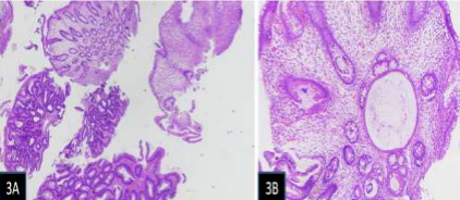 Figure 3: Colonic histopathology: Features of the hamartomatous polyp and tubular adenoma with mild dysplasia (3A), Intervening mucosal biopsy showing marked edema, mild lymphoplasmacytic infiltrates, and cystically dilated glands with inspissated mucin (3B). [Hematoxylin and Eosin stain]