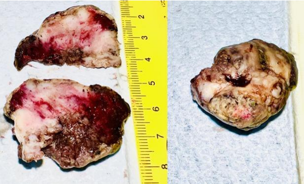 Fig 2. Macroscopy of tonsillar mass showing nodular tumor and serial slicing showed an ill-defined pale white lesion