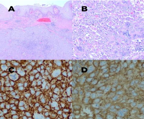 Fig 3. Microscopy reveals A. Ulcerated squamous epithelium overlaying a tumor with syncytial sheets of cells (H&E, 4x) B. Epithelioid and spindle-shaped cells, multinucleate forms (H&E, 10x) C. CD21 positivity (H&E, 10x) D. CD23 positivity (H&E, 10x)