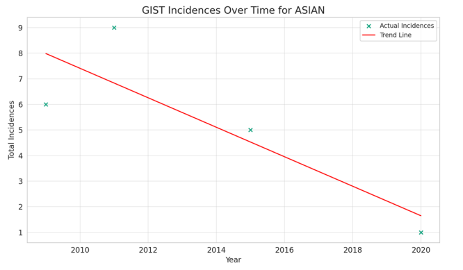 The linear regression analysis for Asians indicated a negative slope of -0.576, with an R-squared value of 0.717. This suggests a pronounced downward trend in GIST incidences among the Asian population over the observed period, implying that GIST decreases as time progresses. The Pearson correlation coefficient for this group further reinforced this finding with a value of -0.847, indicating a strong negative correlation between time and GIST incidences. However, the p-value of 0.153 suggests that while the trend is clear, it may not be statistically significant, indicating a need for caution in interpreting these results as shown in figure 1.