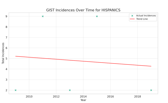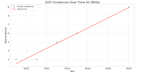 Introduction: Gastrointestinal Stromal Tumors (GISTs) represent the most common mesenchymal neoplasms of the gastrointestinal tract, arising from the interstitial cells of Cajal. These tumors bridge the nervous system and muscular layers of the gastrointestinal tract, playing a crucial role in the digestive process. The incidence of GISTs demonstrates notable variations across different racial and ethnic groups, underscoring the need for in-depth analysis to understand the interplay of genetic, environmental, and socio-economic factors behind these disparities. Linear Regression Analysis is a pivotal statistical tool in such epidemiological studies, offering insights into the temporal dynamics of disease incidence and the impact of public health interventions.