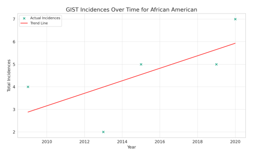 The results from both the linear regression analysis and Pearson correlation coefficients were interpreted to glean insights into the incidence trends of GIST among the studied racial groups. These quantitative findings were complemented by graphical analyses, including scatter plots with lines of best fit for each group, visually depicting the relationship between the year and incidence counts. The graphical representations were instrumental in illustrating the statistical findings, making the trends more accessible and understandable.