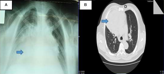 Figure 1: (A) PA chest X-ray (04/24/16) with widening of the mediastinum ocuppied by a radiopaque image. (B) Thorax tomographic scan (04/25/16) with mass-like imaging dependent on the mediastinum, no evidence of adequate cleveage plane.