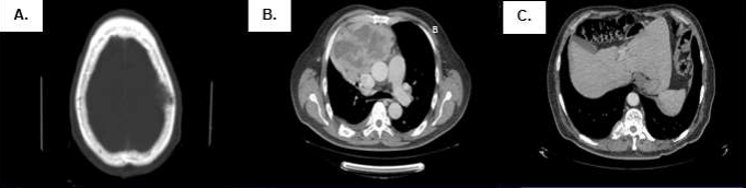 Figure 2. Tomography at diagnosis of the disease (05/30/16). There is evidence of (A) lytic image in cranial calotte, (B) anterior mdediastinal mass of 150mm x 100mm x 151mm infiltrating adjacent structures, and (C) lytic lesions in costals arches y vertebrals bodies.