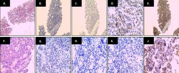 Figure 3. Anatomopathological findings. In the upper row, we observed the immunochemistry panel of the trucut biopsy of the tumor mass. From left & right (A) H&E staining, 400X objective; (B) TTF-1 (-); (C) CK7 (-); (D) CD117 (+); and (E) CD5 (+). In the lower row, we observed the immunohistochemistry panel of the surgical specimen. From left to right: (F) H&E staining, 400X objective; (G) TTF-1 (-); (H) CK7 (-); (I) CD45 (-); y (J) PANCK (+)