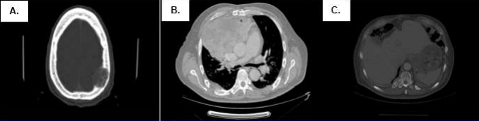 Figure 4. Postoperatory tomography scan (02/28/17). There is evidence of (A) new lytic lesion in cranial calotte, (B) anterior mediastinal mass of 140mm x130mm x 115mm that infiltrate adjacent structures and associated with lymph node conglomerates and right mild pleural effusion, and (C) lytic lesions in costals arches and vertebrals bodies.