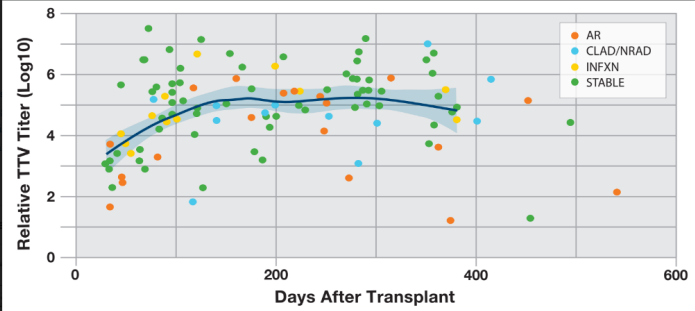 dd-cfDNA is a clinically validated biomarker with high negative predictive value (NPV) for acute rejection increasingly being adopted widely in the U.S. for surveillance of lung allograft status. However, since dd-cfDNA% reflects increased cellular apoptosis and turnover, the test cannot accurately discriminate amongst diverse etiologies of organ injury. In contrast, TTV viral load does not inform of the allograft status per se, rather it serves as a proxy for the net state of IS. Elevation in TTV viral load (VL) has been associated with excess IS and thus increased likelihood of infection. TTV can function as a potential differentiator for injury type in patients with elevated dd-cfDNA. [4, 5] Moreover, the Vienna lung transplant group reported an increase in steady-state TTV VL after the initial 3 months, predictive of infectious complications.[11] This same group was also the first to describe, in a case-control analysis, an association between lower TTV VL and chronic lung allograft dysfunction (CLAD).[12] Recently, TTV VL had been implemented as an indicator of net state of IS, during analysis of efficacy of SARS-CoV-2 mRNA1273 vaccination for lung transplant recipients. A lower TTV VL was associated with higher anti-spike specific humoral response and frequency of protective immunologic status after vaccination. Further, TTV VL was confirmed as “time-dependent” with lower TTV VL in association with a longer time after transplantation and ensuant the reduction in immunosuppressive drug treatment. [13]