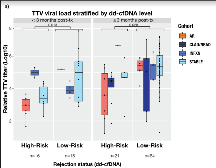 Figure 2a: Association of Torque Teno Virus (TTV) Viral Loads (Log10) on Y-axis with dd-cfDNA% classifier as “High Risk” (>1% dd-cfDNA) versus “Low Risk” (<1% dd-cfDNA) for the following cohorts: acute rejection (AR) (encompassing cellular and antibody-mediated rejection), chronic lung allograft dysfunction or neutrophilic-responsive allograft dysfunction (CLAD/NRAD), allograft infection (INFXN), and stable.