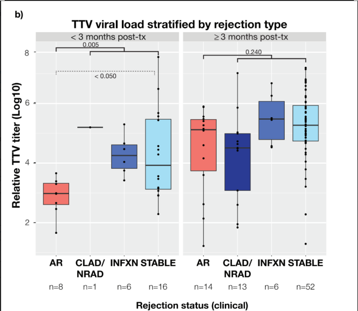 To our knowledge, this is the first study to demonstrate an inverse association between dd-cfDNA% and plasma TTV VL. This intriguing finding is suggestive of a potential causal relationship between reduced net state of immunosuppression and molecular cellular injury involving the allograft, in either the presence or absence of biopsy-proven AR. Further, since biopsy with routine histopathology can be insensitive to cellular or antibody-mediated rejection [14][15], future clinical trials may develop algorithms for treatment when dd-cfDNA% is elevated in association with a low TTV VL in attempt to preserve organ health.[14] The NIH (GRAfT consortium) recently analyzed long-term clinical outcomes, and “extreme molecular injury” (EMI) as defined by a significant elevation in dd-cfDNA (>5.0%) after lung transplantation. Regardless of whether EMI resulted from confirmed AR, infection events or was of unknown etiology (i.e. “primary”), the hazard ratio was approximately 2.78 for later development of severe CLAD or mortality.[16]. From our analysis, TTV VL can potentially complement plasma %dd-cfDNA assessment to distinguish AR from stable and infection cohorts during the initial 3-month period post-LT.