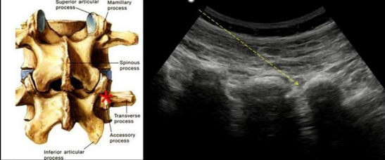 Ultrasound Images of the paraspinal region with a red asterisk locating the targets in the inter apophyseal and facet valleys, where the needle is inserted in a proximal to distal fashion with a dotted arrow indicating the path.