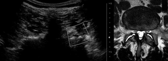 Transverse ultrasound image at the L4-L5 level showing facet arthrosis comparing with magnetic resonance image in the axial T2 plane.