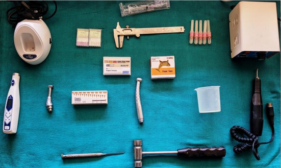 1. Endomotor (TROUSENDO) 2 Syringe (NIPRO) 3.K file no # 10-15 (MANI) 4. Vernier calliper 5. 30 gauge side-vented needle (DENTSPLY ProRinse) 6. Micro motor and straight hand piece (API) 7. Paper points (DIADENT) 8. Blue flex rotary file (BLUE FELX) 9. Endo gauge(DENTSPLY) 10. Contra angle Airrotor (APPLEDENT) 11. Beaker (Borosil) 12. Chisel and mallet(API)