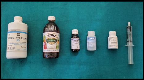 1. Sodium hypochloride 5% (DENTPRO) 2. Apple vinegar 5%(HEINZ) 3. EDTA(CANALARGE) 4. Q-mix 2in1(DENTSPLY) 5. MTAD(DENTSPLY)
