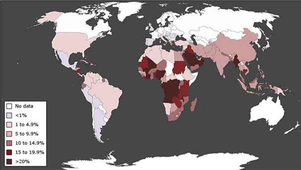Figure 1: The map shows the prevalence of G6PD deficiency variants throughout the world, with darker colours indicating higher prevalence. It was constructed from several sources; see the source document for details. Refer to UpToDate for additional information on the epidemiology, clinical presentation, and diagnostic evaluation for G6PD deficiency.