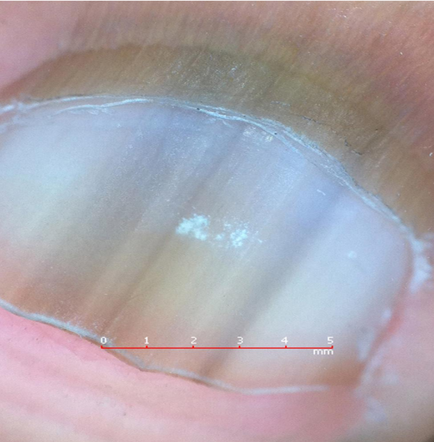 MLN: is common in individuals with darkly pigmented skin and typically affects multiple nails in individuals of African descent, melanonychia occurs in up to 77 percent of young adults and almost 100 percent over 50 years. In Japanese populations, it affects 10 to 20 percent of adults. On dermoscopy, this type of physiologic MLN presents as a Gray homogeneous band with or without thin regular lines (figure 2) .(2).