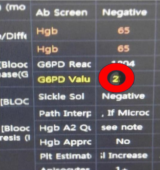 Figure 3: One of the laboratory blood tests of the case showing low G6PD, Normal range for his age is 4.0-13.0 U g Hb
