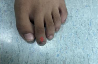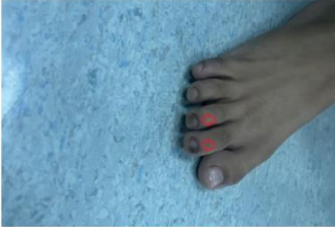 Figure 4-5: Our case report toenails melanonychia in both feet as showed here the right foot with two nails and the left one with only one nail.