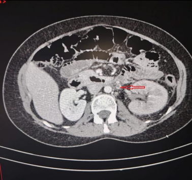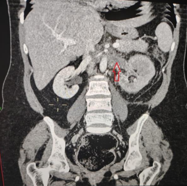 Figure 3: Coronal view, contrast-enhanced CT scan demonstrates distended thrombosed left renal vein (red arrow)
