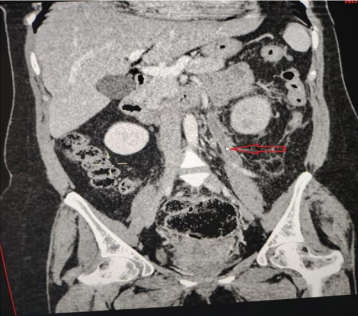 Figure 2: Coronal view, contrast-enhanced CT scan demonstrates distended thrombosed left ovarian vein (red arrow)