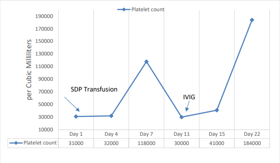 Figure 1: Line diagram showing trend of platelet counts and interventions taken