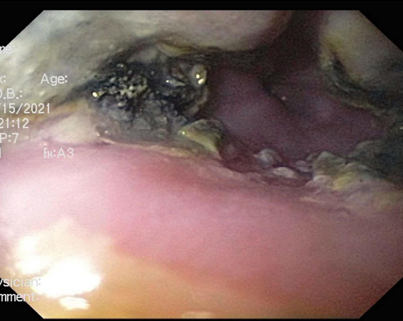 Figure 1: Esophagoscopy showing eschar and erosion in the distal anterior esophagus.