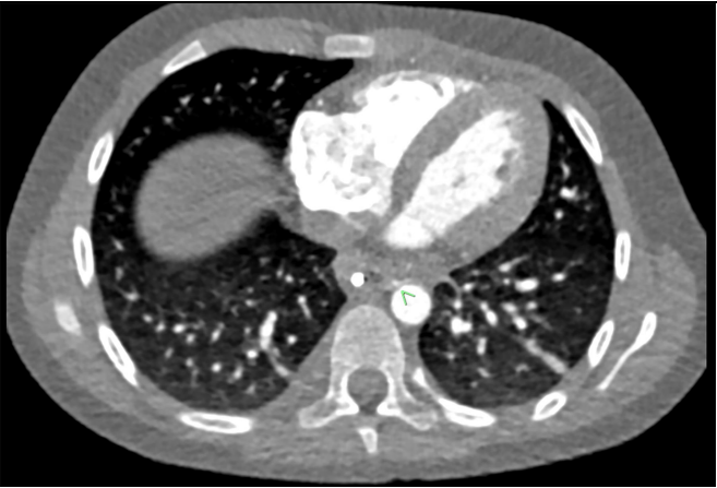 Helical Computed Tomography Angiography (CTA) of the chest was performed following the bolus intravenous administration of contrast. Circumferential esophageal wall thickening around the distal esophagus at the site of esophageal injury was seen. There was a linear arterial blush from the descending thoracic aorta into the posterior inflamed wall of the esophagus at the site of the esophageal injury. There was no mediastinal enhancement nor fluid. (Figure 2).