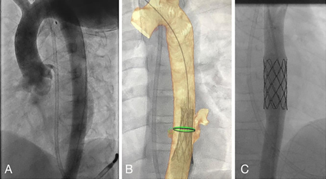 Panel C demonstrates a still frame from a 3D rotational angiogram demonstrating satisfactory expansion of a stent complex within the intended landing zone in the descending thoracic aorta.