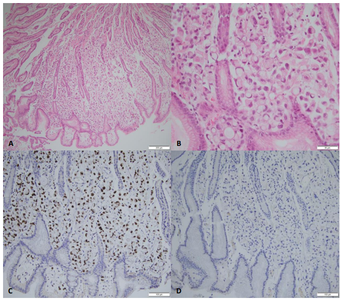 Figure 1: Gastric mucosa showing heavy infiltration of the lamina propria by adenocarcinoma (A, H&E x100). High-power view reveals an independent signet-ring cell proliferation (B, H&E x400). Immunohistochemistry studies show positive staining with GATA3 (C, x200) and negative staining with CDX2 (D, x200)
