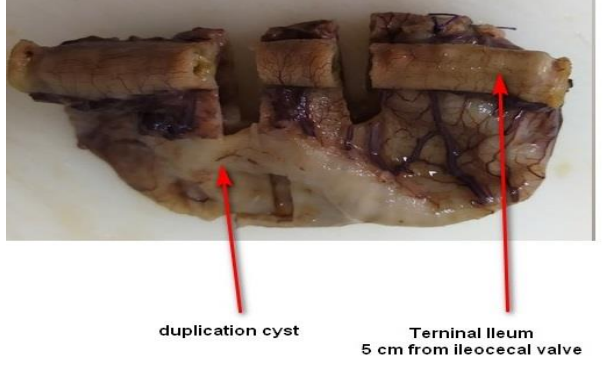 Gastrointestinal duplication is a rare abnormality of the embryological development of the gastrointestinal tract, with an estimated incidence of 1/10,000 in live births and 1/4,500 in neonates and fetuses. It can appear in any portion of the intestinal tract, with the ileum being the most common location. A 5-day-old patient with a prenatal diagnosis of megacolon or mesenteric cyst was diagnosed during antenatal follow-up. A cystic mass attached to the terminal ileum was found approximately 5 cm from the ileocecal valve, which was resected and classified as Type 1B intestinal duplication according to the Long classification. Diagnosis is suggested by abdominal X-rays, ultrasonography, and computerized axial tomography scan with contrast studies, but the definitive diagnosis is made by histopathological examination of the surgical specimen.