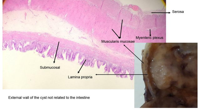 Intestinal duplications are gastrointestinal anomalies that can cause peptic ulcers in unlikely sites such as the ileum and posterior mediastinum. The wall of the duplicated segment is usually complete, with only rarely communicating with the intestinal lumen. Sometimes, the duplication forms an intrinsic part of the intestinal wall with fusion between the muscularis propria of the duplication and that of the normal intestine. The cystic lumen usually does not communicate with the intestinal lumen, and non-communicating cysts mimic the intestinal wall with enteric mucosa, submucosa, muscularis propria, and a myenteric plexus. Intramural duplications do not have a muscular layer but share the muscular layer with the adjacent intestine.