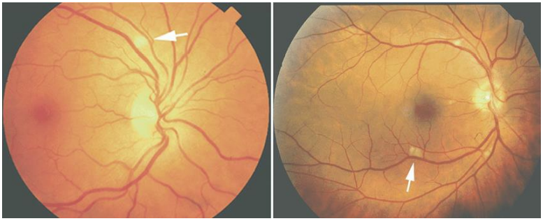 Ophthalmic examination revealed bilateral peripapillary cotton wool spots, suggestive of microvascular ischemia and retinal involvement, which are known complications of SLE.