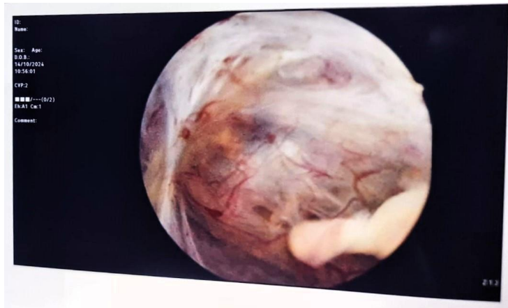 Hysteroscopy and D&C was performed on 14th October 2024, with pre-procedure β-hCG at 1768 IU/L (Fig 2). Histopathology confirmed placental trophoblastic disease (PTD).