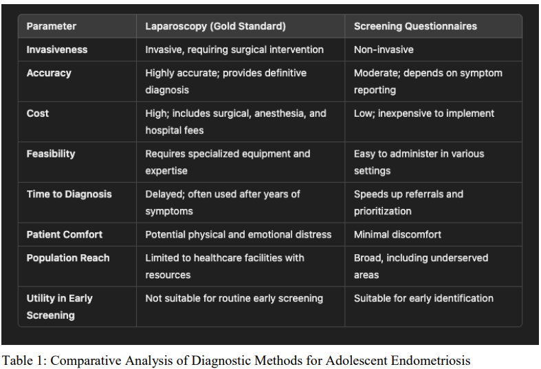 Table 1: Comparative Analysis of Diagnostic Methods for Adolescent Endometriosis