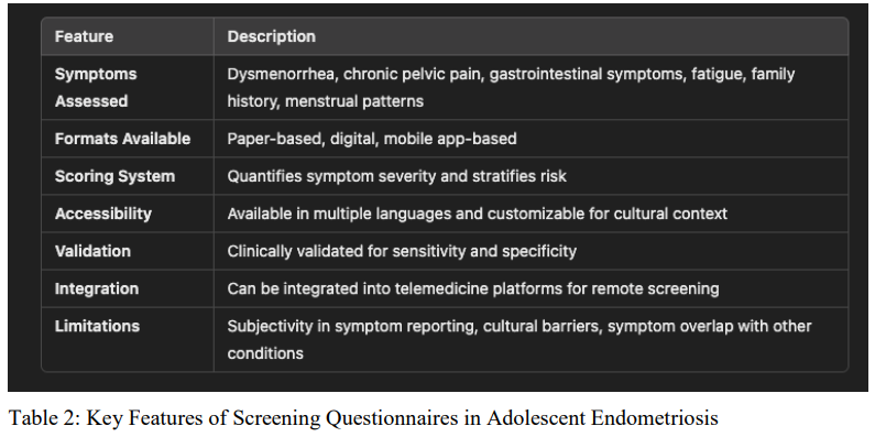 Table 2: Key Features of Screening Questionnaires in Adolescent Endometriosis
