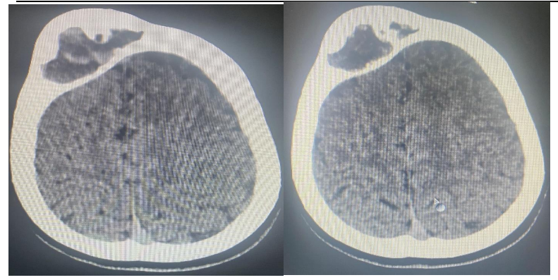 Fig 2 A and B : Head CT: Showed: expansile lytic lesion seen in the right frontal bone ,This lesion shows ground glass appearance .The diploic space is widened with displacement of the outer table .It measures 50x28 mm and no fracture seen. It causes mass effect on the frontal lobe. There is no periosteal reaction