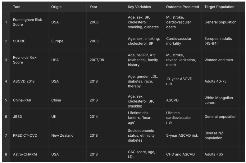 Methods: A systematic review of cardiovascular risk assessment tools was conducted using data from peer-reviewed journals, clinical guidelines, and cohort studies. Tools analyzed included the Framingham Risk Score (FRS), Systematic Coronary Risk Evaluation (SCORE), Reynolds Risk Score (RRS), ASCVD 2018 Risk Estimator, China-PAR, PREDICT-CVD, JBS3, and advanced tools such as Astro-CHARM and Coronary Artery Calcium (CAC) Scoring. Key parameters such as age, sex, lipid profile, blood pressure, diabetes, smoking status, inflammation markers, and socioeconomic factors were compared. Risk thresholds, predictive outcomes, and population-specific applicability were systematically reviewed.
