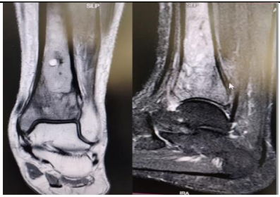 Patient was evaluated in our clinic, the radiograph showed the presence of distal tibial metaphyseal rarefaction and osteolytic lesion of about 2.5* 2.5 cm, there was no periosteal reaction or destruction and no soft tissue involvement (figure1). Blood parameters, bone profile and inflammatory markers were with in normal.