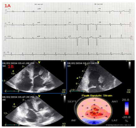 Figure 1A. ECG performed to a 65-year-old patient with multiple myeloma and AL amyloid cardiomyopathy showing sinus rhythm with first degree atrioventricular block, low QRS voltage in most of limb leads (except lead II), and pseudo anterior infarction pattern with poor R wave progression in precordial leads. 1B. Echocardiographic apical 4 chambers, apical three chambers, apical 2 chambers views with the 2D GLS Bull’s eye display depicting left and right ventricular hypertrophy with granular sparkling pattern, biatrial enlargement, small ventricular cavities and thickening of the interatrial septum, very reduced GLS (-4.3%) and the typical relative apical sparing pattern on 2d GLS strain Bull’s eye display.