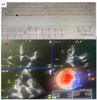 Figures 2A. ECG performed to a 59-year-old patient male with monoclonal gammopathy of unknown significance (MGUS) and ATTRwt amyloid cardiomyopathy what depicts sinus rhythm, low QRS voltage in the horizontal plane, pseudo-infarction pattern in precordial leads with non-specific T wave abnormalities in I-aVL and inferior leads and T wave inversion in V6 lead, left atrial enlargement signs and poor R wave progression in precordial leads. 2B. Echocardiographic apical 4 chambers, apical three chambers, apical 2 chambers views with the 2D GLS Bull’s eye display depicting idem findings like figure 1B.