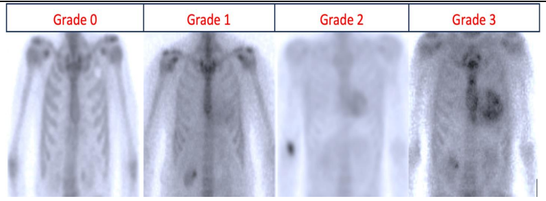 Figure 3. 99mTc-DPD scintigraphy and Perugini visual scoring of cardiac uptake: Grade 0 represents no cardiac uptake, grade 1 represents mild cardiac uptake (less than that in bone), grade 2 represents cardiac uptake greater than that in bone (but bone uptake still remains visible), and grade 3 represents substantial cardiac uptake with only a weak or no signal evident in bone.