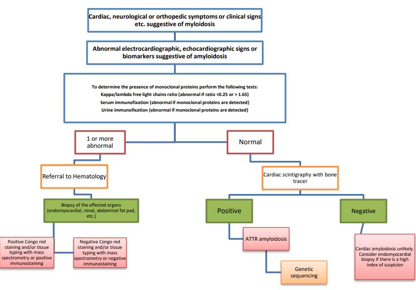 Identification of monoclonal protein (by serum protein immunofixation, urine protein immunofixation, or serum free light chain ratio analysis) along with echocardiographic or CMR findings consistent with cardiac amyloidosis is suggestive of AL amyloidosis but may also be caused by ATTR amyloidosis (or a rarer cause of cardiac amyloidosis) with an unrelated monoclonal gammopathy of undetermined significance (MGUS)71.