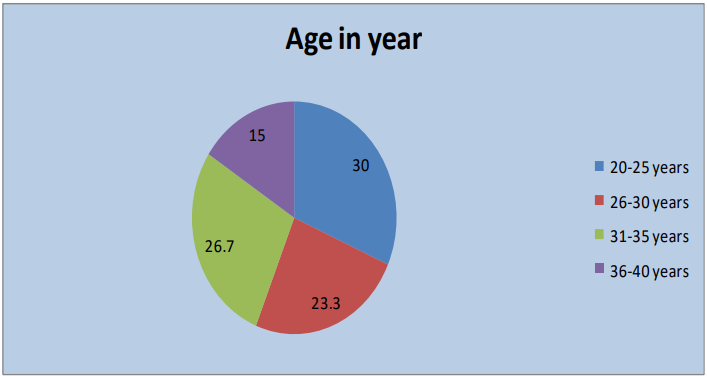 From the table II & figure 1, the pie diagram shows the distributions of Staff Nurses according to age. 30.0% respondents were belongs to the age group of 20-25 years, 23.30% Respondents were belongs to the age group of between 26-30 years, 26.70% was found in the age group of between 31-35 years, 15.00% respondents were belongs to the age group of between 36-40 years, 5.0% respondents were belongs to the age group of between Above 40 years The maximum participant in the research study from the age group of 30-25 years.